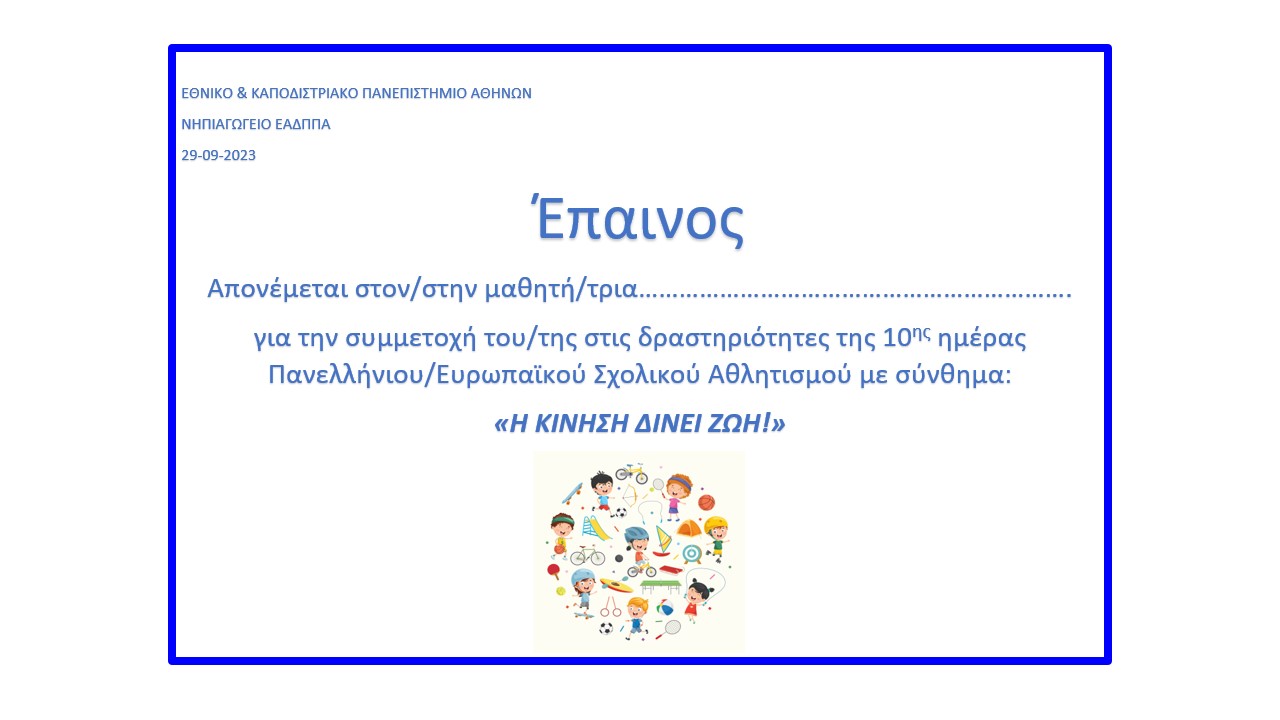 - Απονομή επαίνου για τη συμμετοχή στη «10η Πανελλήνια Ημέρα Σχολικού Αθλητισμού-Ευρωπαϊκή Ημέρα Σχολικού Αθλητισμού 2023.