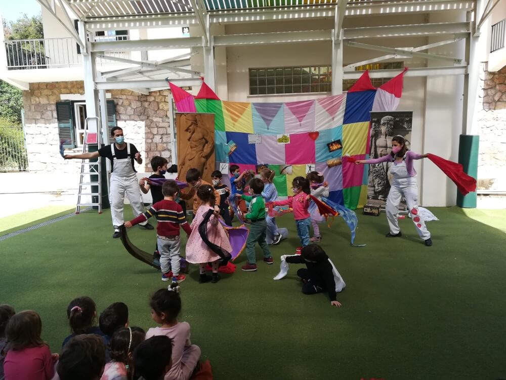 Τη φετινή σχολική χρονιά 2021-2022,το μάθημα της Ελληνικής Μυθολογίας με πρωταγωνιστές τους 12 Θεούς του Ολύμπου και τον Οδυσσέα, πραγματοποιήθηκε με αφηγηματικό τρόπο με την βοήθεια βιβλίων και προβολών μέσω του προτζέκτορα του σχολείου και με την ενεργή συμμετοχή των παιδιών μέσω της προφορικής επικοινωνίας, της αλληλεπίδρασης, της εικαστικής έκφρασης και της δραματοποίησης.